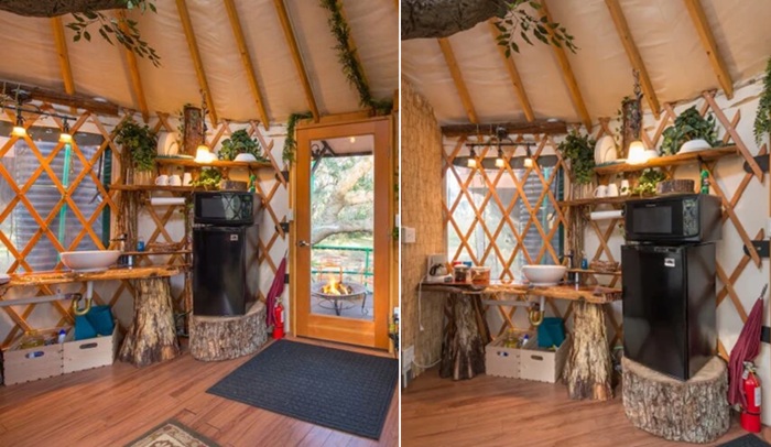 Чтобы гости в полной мере вкусили жизнь на дереве, большая часть юрты остеклена. Плюс в центре купола предусмотрен световой люк, наполняющий жилое пространство светом и причудливыми тенями, которые образует движение верхушек деревьев, летящие облака и мерцающие звезды. Поскольку она является основным жилым пространством, то здесь обустроили гостиную, кухню, столовую и большую спальную зону с двуспальной кроватью, занимающей значительную часть юрты. Единственным укромным уголком стала благоустроенная ванная комната, которая в полной мере обеспечивает необходимые бытовые удобства.