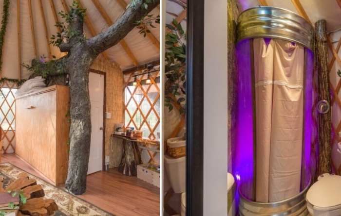 Стоит отметить, что это убежище лучше назвать мини-комплексом, ведь установкой юрты на высоте 5 метров не обошлось, хотя она и является основным жилым объектом, закрепленным на высоких опорных столбах между двумя гигантскими дубами. В общей сложности многоуровневая композиция возвышается на 6 метров, что делает ее внушительной и привлекательной одновременно. Главной неожиданностью, которую уж точно не ожидают увидеть гости, является лифт, замаскированный под ствол дерева. Он упрощает крутой подъем к юрте, поднимая посетителей без всяких «воздушных» мостов и веревочных лестниц. Хотя нижний уровень и задействован (находятся бытовые и складские помещения, в которых постояльцы могут оставить спортивное снаряжение), но и винтовой лестницы здесь не предусмотрено.