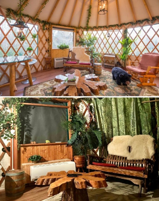 Гостиная-столовая в юрте на дереве (Danville B&Bs).