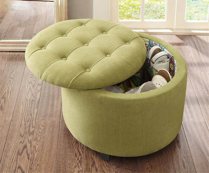 Хранение вещей — это вечная проблема. Если места на чердаке или в сарае нет, то необходимо найти его в самом доме. К тому же, не все вещи можно отнести в сарай. Шкафы в таком случае всё равно стоит выбирать компактные, потому что именно они могут занять всё свободное пространство. Но при этом они должны вмещать в себя полезной загрузки по-максимуму. А вот на счет открытых полок стоит подумать, они будут создавать эффект лёгкости, но при этом сильно пылиться. Отличным вариантом для хранения также могут стать пуфики. Они, как альтернатива журнальному столику с полками, прекрасно пишутся в интерьер гостиной, плюс к этому будут дополнительным сидячим местом. Туда вполне поместятся тапочки, игрушки, провода, пледы и другие вещи.