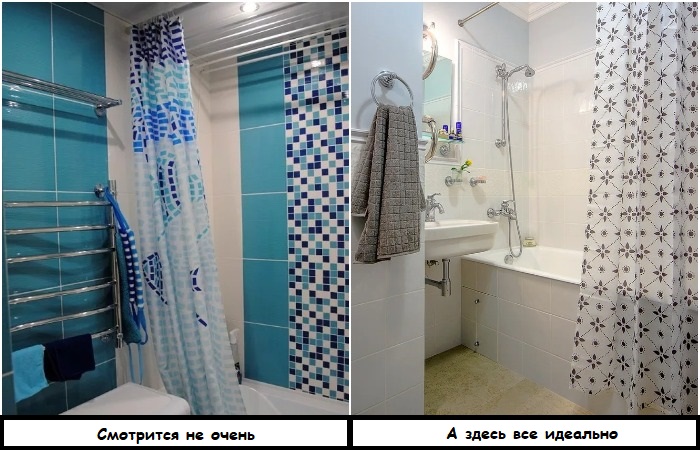 Пожалуй, самый простой и бюджетный способ обновить ванную комнату – повесить другую душевую шторку. Но это не значит, что нужно менять одну занавеску с дельфином на другую – такие изделия давно не в моде и дешевят интерьер ванной. Намного лучше смотрятся однотонные шторки из качественных материалов или варианты с геометрическим, абстрактным принтом. Также можно повесить тканевую занавеску, но в этом случае следует разместить еще одну шторку с внутренней стороны, чтобы она принимала основной удар на себя.