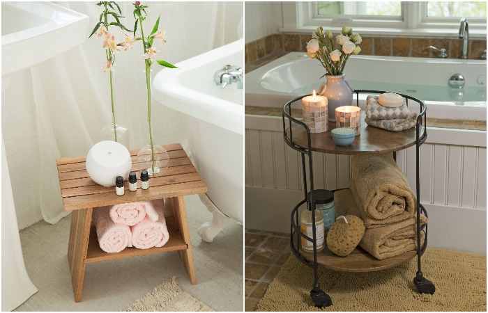 В интерьерах скандинавских ванных часто можно увидеть маленький аккуратный столик. Если у вас просторный санузел, обязательно возьмите эту идею на заметку. На такую мебель удобно ставить ароматические свечи, вино или книгу. Только представьте: вечер, расслабляющая музыка, горящие свечи, и вы лежите в пенной ванне с бокалом вина. А еще можно прочитать очередную главу любимого романа, наслаждаясь приятной обстановкой. Идеально, правда? Кстати, этот же столик в другое время можно использовать для размещения декора. О нем пойдет речь ниже.