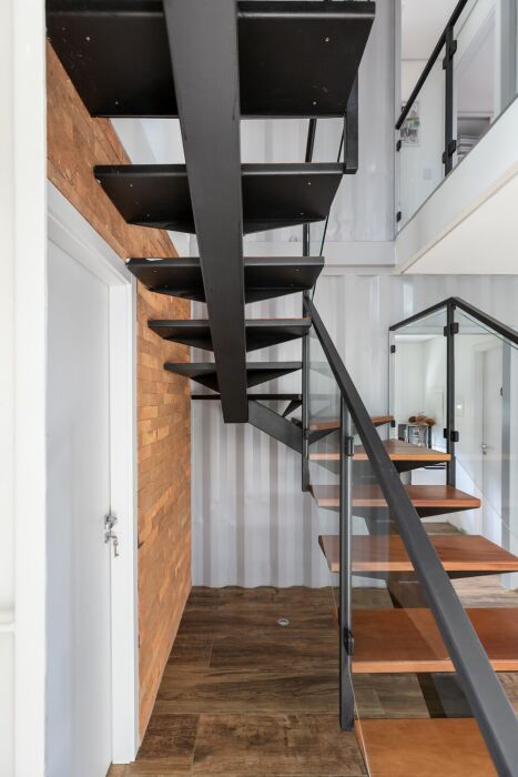 Эффектная стальная лестница под стать индустриальной эстетике интерьера Container House RD (Бразилия). | Фото: casa.abril.com.br.