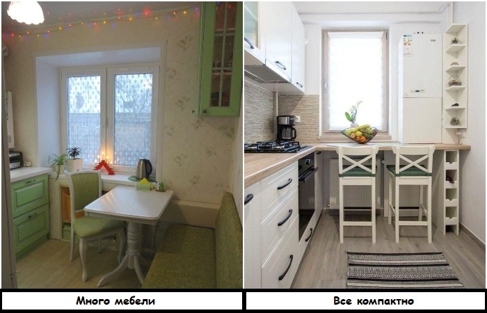 Пожалуй, это самая банальная и очевидная ошибка, но от этого не менее популярная. В попытке разместить на крохотной площади всю необходимую мебель, мы просто перегружаем комнату, делая ее невероятно тесной и неудобной. Из-за большого количества предметов не остается никакого пространства для маневров: по кухне сложно передвигаться, трудно открывать шкафы, ящики и холодильник. А еще мы постоянно цепляемся то за стул, то за уголок стола. На такой кухне не то, что готовить, даже находиться не хочется.