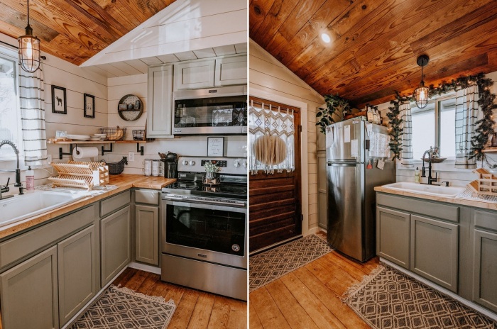 Под кухню выделили достаточно места, чтобы Кэти могла побаловать семью домашними блюдами, тем более, что преображенный домик находится вдали от населенных пунктов. Да и со временем семейство пристрастилось к ведению натурального хозяйства, отдавая предпочтение собственноручно выращенным овощам, зелени, ягодам и яйцам, которые несут их курочки. Это самое любимое место хозяйки, которая сделала все, чтобы у нее была большая рабочая поверхность, необходимые удобства, бытовая техника и много мест для хранения, что необходимо на столь миниатюрных площадях для поддержания порядка. Продуманные до мелочей решения сделали кухню одновременно функциональной и стильной, что очень радует семейство.