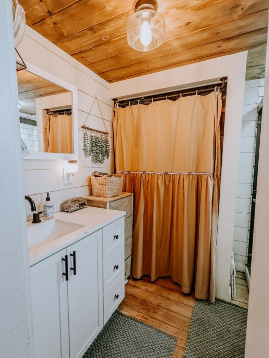 Не обошлось и без благоустроенной ванной комнаты, которую роскошной не назовешь, но в ней есть все необходимое для принятия водных процедур. Им удалось установить вместительную тумбу со встроенной раковиной, унитаз и организовать душевую, стены которой облицевали белой керамической плиткой. Чтобы не устанавливать лишние двери, душевую и нишу с полками, где хранятся моющие средства и вся необходимая бытовая утварь для уборки, спрятали за обычными водонепроницаемыми шторками. В продолжение темы трансформаций своими руками предлагаем заглянуть в дом-корабль, который требовалось снести, а креативная девушка преобразовала его в таинственный «пиратский рай».