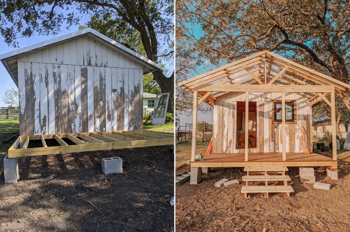Пара, 7 лет прожившая на съемных квартирах, активно взялась разрабатывать проект преобразований, вдохновляясь интересными примерами, который смогла найти на просторах интернет и своими желаниями. Это им пришлось делать самостоятельно, поскольку не было финансовой возможности нанимать профессионалов, как и строителей или плотников. Для начала нужно было избавиться от хлама, накопившегося за многие десятилетия и приступить к укреплению деревянной конструкции сарая, которая уже была ветхой и небезопасной. Также потребовалось добавить окна и частично приподнять потолок, чтобы крошечное пространство будущего дома было не таким давящим.
