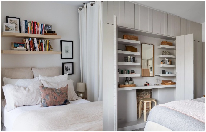 В спальне можно и поставить шкаф, и повесить открытые полки