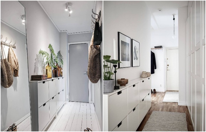Чтобы сделать любую комнату просторнее, нужно убрать из нее лишнюю мебель. А когда речь идет об узком длинном коридоре, это важно вдвойне. Старайтесь не перегружать пространство массивными предметами гардероба, и оставлять только то, что вам действительно нужно. Также стоит подбирать вместо классических габаритных изделий более компактные, например, полноразмерную напольную тумбу лучше заменить узкой подвесной консолью, а громоздкую вешалку – настенными крючками. Что касается шкафа, то здесь тоже есть свои нюансы. Важно, чтобы он был встроенным, а не отдельно стоящим, с фасадом в тон стен. Фурнитуру выбирайте максимально нейтральную, чтобы она не сильно выделялась на фоне шкафа. Зеркальные дверцы, о которых мы упоминали выше, станут прекрасным дополнением. Также вам могут понадобиться 8 приемов, как сохранить идеальную чистоту в прихожей даже в дождливую погоду
