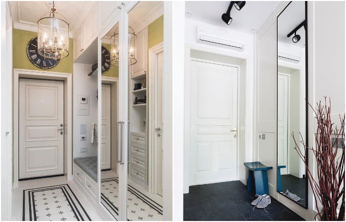 Не хотите заморачиваться с перекраской стен? Тогда просто повесьте зеркало. Это отличный способ сделать узкий коридор визуально шире, так как отражение создает ощущение глубины и иллюзию большего пространства. Здесь есть два варианта: можно повесить одно большое зеркало или даже зеркальное панно, а можно сделать композицию из нескольких изделий разных размеров. Также отличным решением станет шкаф с зеркальными дверцами и панели высотой от пола до потолка.