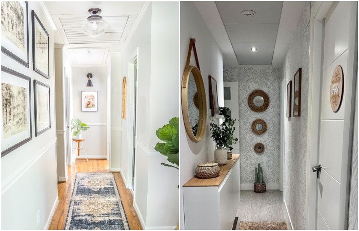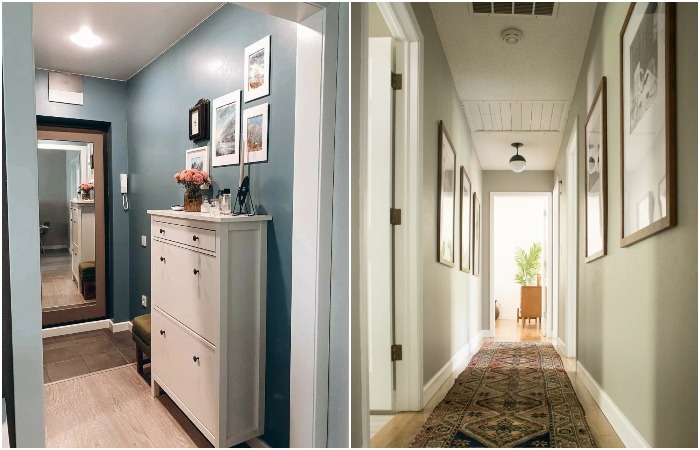 Если вы решили покрасить стены, чтобы они были однотонными, можете смело вешать на них картины или постеры. Полотна прекрасно смотрятся на фоне нейтральной отделки, позволяя грамотно расставить акценты и визуально разделить длинное пространство коридора на зоны.