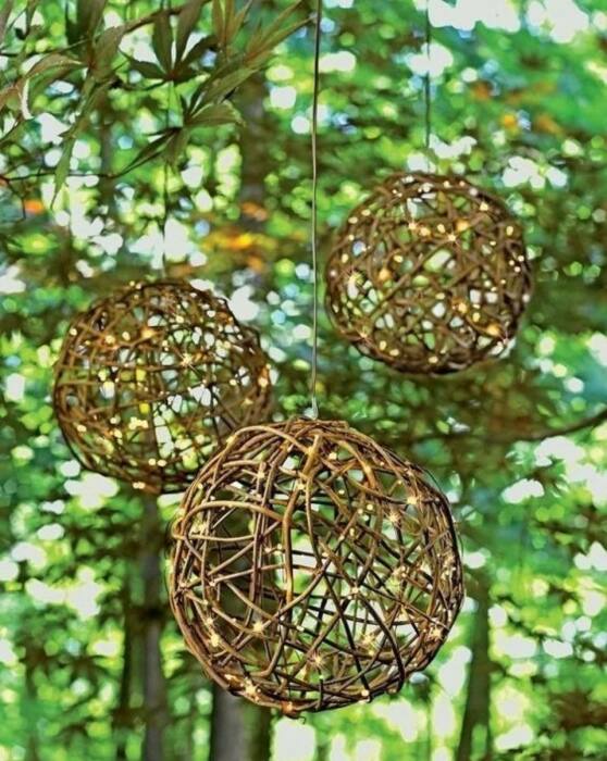 Мода на разнообразные шарообразные светильники из цветных нитей существует довольно давно. Из скрепляют клеем ПВА, чтоб они держали нужную форму и для большей прочности. Но, к сожалению, для улицы такие изделия совсем не подходят, потому что после нескольких дождей они размякнут, а ветер может сломать такую конструкцию. Зато вот более натуральные материалы, например, лоза дикого винограда, отлично выдержит разнообразные погодные условия. В целом процесс создания натуральных шарообразных светильников такой же как и из нитей. Для этого потребуется надуть шар нужного размера и обмотать его виноградной лозой. Сделать это нужно достаточно густо, чтобы конструкция была прочнее, но при этом не стоит забывать, что через сферу всё-таки должен будет проходить свет, потому что это будущий светильник. Чтобы форма держалась клей не подойдёт, нужно будет закрепить кончики лозы проволокой и сдуть мячик. В такой шар нельзя будет ставить никакие свечи, для того, чтобы сделать внутри него свет, необходимо воспользоваться светодиодными лентами или гирляндой, которые не будут нагреваться. Также подойдёт свеча обманка, она максимально безопасна и даёт при этом огромное количество света. Когда таких композиций на участке много смотрится просто волшебно.