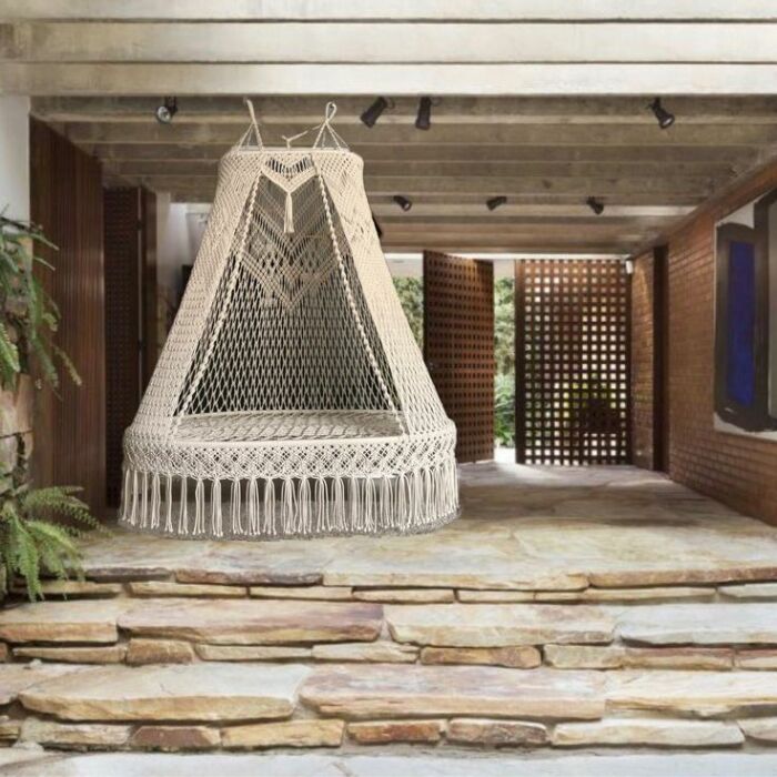 Небольшой подвесной гамак выглядит чудесно, особенно, если он плетенный в технике макраме из светлых ниток и с бахромой. Но на деле он просто не нужен, а стоит немалых денег. Сидеть в таком гамаке будет неудобно, у него нет спинки, а вставать будет ещё сложнее, потому часто использовать не получится. Пожилые люди вообще не смогут им пользоваться, потому что в раскачивающийся гамак нужно и как-то залезть без опоры. При этом подобрать оптимальную высоту, на которую его можно будет повесить, практически невозможно. Находящийся в нём человек точно будет или выше или ниже всех остальных. А балка, которая выдержит вес взрослого человека, при этом тоже нужна очень прочная. При большом желании проще купить не сидячий, а лежачий гамак в такой технике. На нём по крайней мере можно будет поспать или почитать книгу, но и большого удобства и тут ожидать не стоит, можно легко запутаться и вовсе упасть на землю. И обычно они в целом висят только для красоты