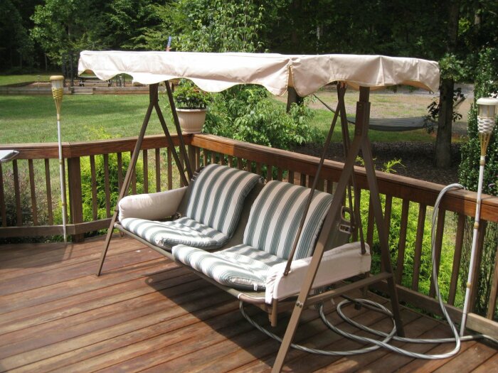 Классика дачного участка — садовые наземные качели. Сама конструкция очень большая и тяжелая, хоть она и разборная, собирать её каждый сезон будет сложно и неудобно. К тому же такие качели могут быть не рассчитаны на рост человека, который захочет на них прилечь. А если они и предназначены для лежания, имеют подлокотники, подушки и достаточную ширину, их цена тут же сильно возрастает. Качаться на них можно только для вида, а вот устойчивость сидения это уменьшает, для этих целей подойдут обычные качели. Из плюсов, конечно, мягкое сидение и тент наверху, отлично защищающий от солнца. Если есть пустое место, то да, вполне хороший вариант, но когда такие громоздкие качели некуда поставить не стоит на них тратиться. А передвигать их по участку, и особенно в одиночку, не получится совсем, вес очень большой, ведь обычно они выполнены из железа.