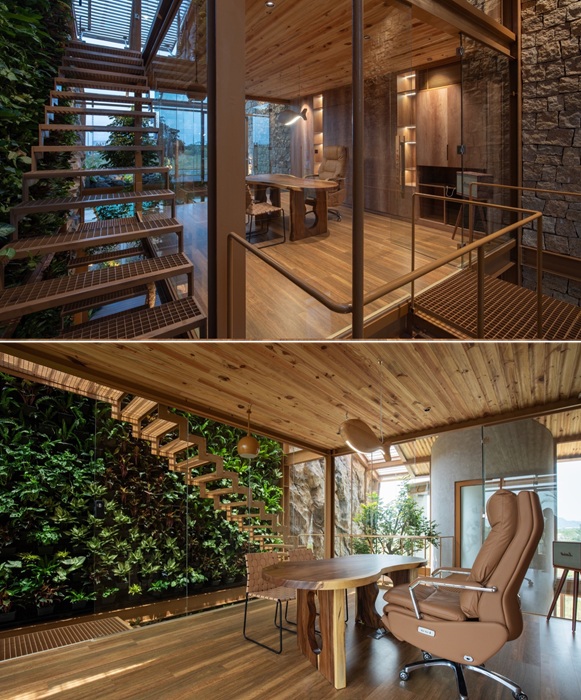 Как и следовало ожидать, на первом этаже находится офис, в котором планировал работать как сам владелец дома, так и нанятые сотрудники. Для них и посетителей созданы все условия для творчества, плодотворной работы и отдыха (имеется еще и оборудованная кухня-столовая). Здоровой атмосфере и приятному микроклимату посодействовали не только свет из огромных окон, продуманная система вентиляции и другие бытовые удобства. Неожиданно, как для большинства офисов, соседство с настоящим водопадом за окном, живой растительностью, занимающей одну стену офиса, огромным деревом, пронизывающим стол в зоне отдыха и, растущим в вестибюле, а также выход на небольшие террасы, обеспечивает ощущение нахождения на природе, что благотворно влияет на физическое и психическое здоровье работников, проживающих в крупных городах.