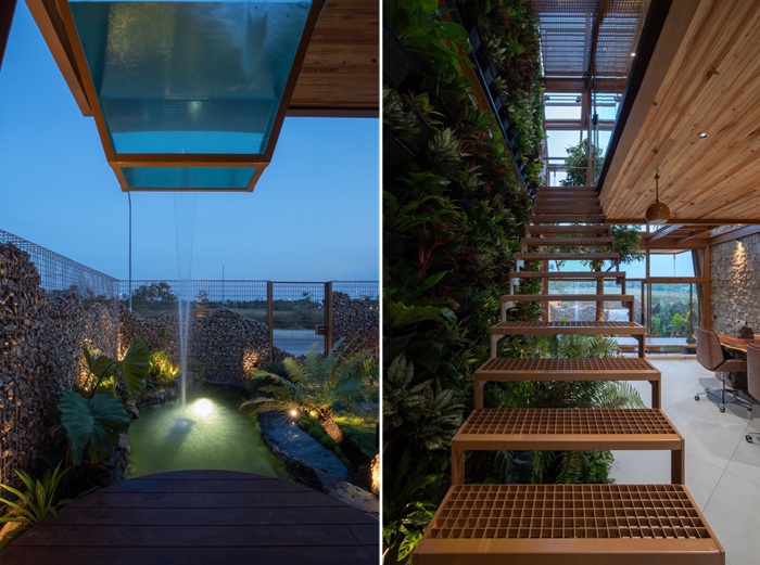 По мнению авторов Novate.ru, все же самой выдающейся особенностей является каскадный водопад и большой стеклянный аквариум на балконе, предусмотренные на переднем фасаде здания. Вода проходит между элементом перекрытия, создавая небольшой родник, перетекающий в аквариум, откуда ниспадает в садовый пруд, создавая захватывающее зрелище. Обилие воды помогает регулировать температуру, при этом создает успокаивающую атмосферу благодаря умиротворяющим звукам, падающих потоков. Еще один яркий пример того, как во Вьетнаме в последнее время трепетно относятся к озеленению и созданию приятного микроклимата в помещениях можно увидеть в одном из районов Хошимина. Чего только стоит дом-деревня, в который превратился Urban Farming Office (Офис городского фермерства).