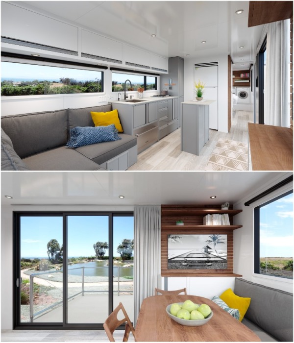 Гладкие блестящие поверхности интерьера мобильного дома гармонично сочетаются с предметами мебели, сделанными с натурального дерева. | Фото: shorelineareanews.com.
