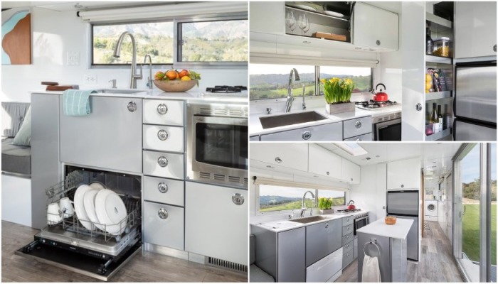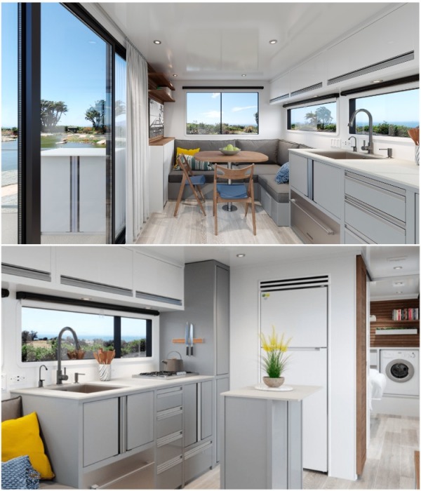 Внутреннее пространство трейлера 20,4 кв.м. позволило разместить все необходимые для комфортного проживания, ведь по сути это размер малогабаритной квартиры. Рационально используя каждый сантиметр полезной площади, разработчики фирмы смогли оформить полноценную кухню, в которой есть все необходимое для приготовления и хранения пищи, а для облегчения домашнего труда установили даже посудомоечную машину. Причем некоторое кухонное оборудование имеет съемные элементы и может быть перемещено на выдвижную платформу, с помощью которой можно организовать террасу, где и устанавливается варочная поверхность, гриль-система и полноценная зона барбекю.