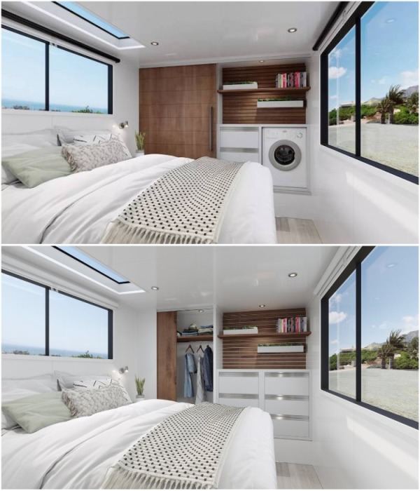 В основной спальне организовали скрытые системы хранения, где за раздвижной дверью спрятали вещевой шкаф, комод и стиральную машинку (кемпер LV 2020). | Фото: hiconsumption.com