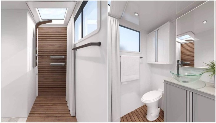 Поскольку кемпер LV 2020 рассчитан на постоянное проживание, то в нем оборудовали полноценный душ и туалет, поэтому жилой автомобиль никак не будет отличаться от стандартной квартиры. Чтобы ванная комната не казалась совсем крошечной, в ней создали потолочное окно, так что незабываемые впечатления во время купания под звездами будут обеспечены. Такого рода окна установлены и над кроватью, на всем остальном же пространстве предусмотрены стандартные окна и большая стеклянная раздвижная дверь. Светлые тона интерьера и наличие достаточного количества окон создают не только иллюзию большего пространства, но и обеспечивают приток дневного света, что благоприятно влияет на здоровье обитателей крошечного домика.