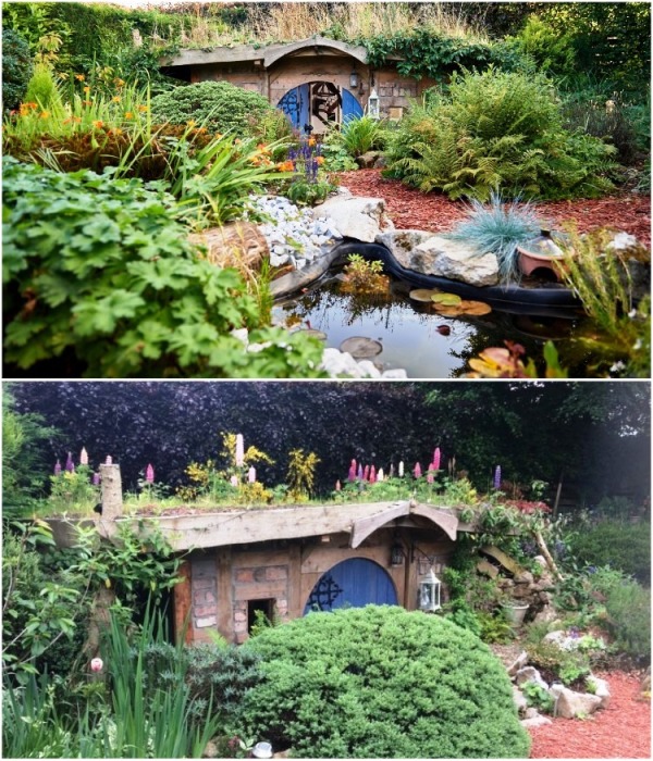 На своем приусадебном участке семейство Хилдов оформили еще и пруд, а также посадили много цветов и вечнозеленых растений («Нора хоббита», Великобритания). | Фото: budport.com.ua.