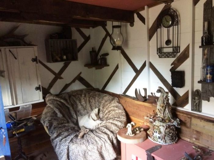 В своей мастерской Chris Hield нашел местечко и для зоны отдыха («Нора хоббита», Великобритания). | Фото: housebeautiful.com.