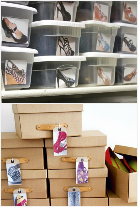 Ярлыки и маркеры на коробках. | Фото: Fishki. Если вы предпочитаете хранить обувь в коробках или контейнерах, хорошо бы их промаркировать. Для этого можно сделать снимки каждой пары, распечатать их и прикрепить на коробку или же от руки написать, какая именно пара хранится в той или иной коробке.