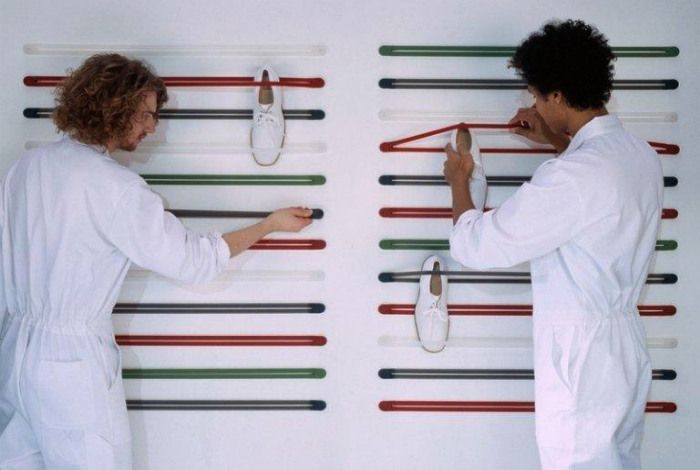 Кроссовки и кеды на крючках. | Фото: Тироз. Спортивную обувь со шнурками можно хранить в подвешенном виде на небольших крючках, прикрученных к стене. Такой способ хранения отлично подойдет для прихожей загородного дома или коридора городской квартиры, оформленного в определенном стилистическом направлении.