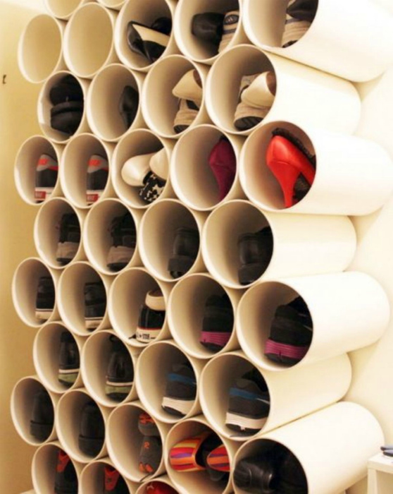 Самодельный органайзер из труб. | Фото: Interesno.cc. Довольно практичный и вместительный органайзер для обуви можно смастерить своими руками, используя ПВХ-трубы большого диаметра. Для его создания нужно разрезать трубы на одинаковые куски и прикрепить каждый к стене.