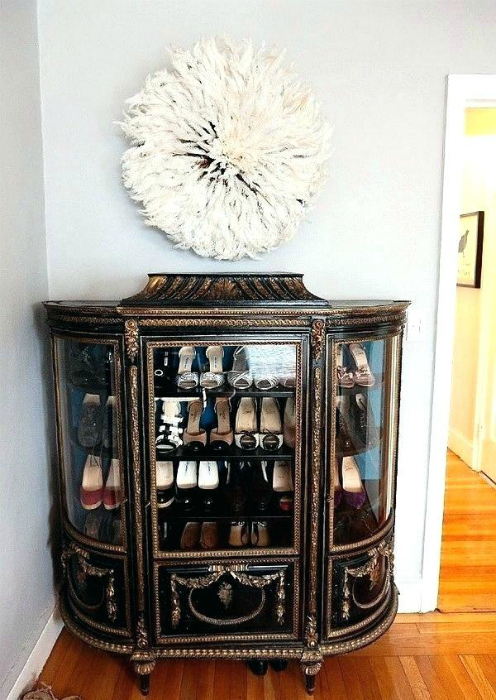 Обувь в стеклянном шкафу. | Фото: Organome.co. Самые красивые пары туфель и босоножек можно разместить в серванте, витрине или на стеллаже со стеклянными дверцами. Обувной шкаф такого типа можно поставить в прихожей, гостиной и даже спальне, чтобы любимая обувь радовала глаз вне зависимости от сезона.