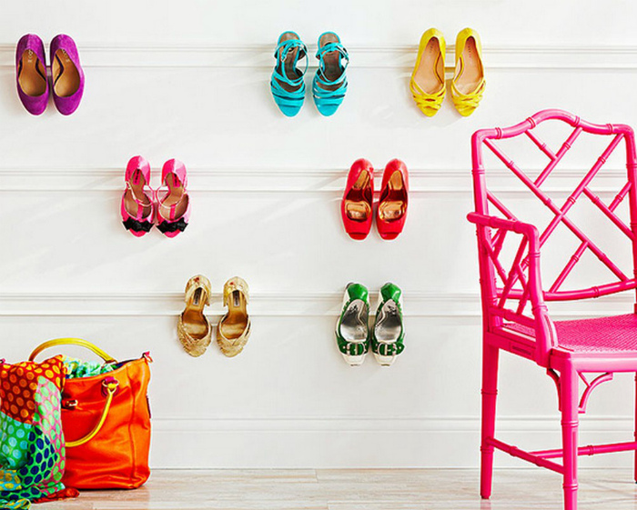 Обувь на карнизах. | Фото: Giornalettismo. Яркие качественные туфельки в хорошем состоянии можно закрепить на карнизах, прикрепленных к одной из стен прихожей или спальни. Подобная система позволит не только решить вопрос хранения обуви, но и превратить ее в украшение интерьера.