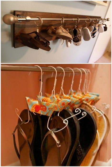 Хранение обуви на крючках и вешалках. | Фото: Pinterest, Fashion, Style & DIY. Легкую обувь, вроде шлепок, босоножек, кед и балеток, можно хранить в подвешенном состоянии на крючках или на самодельных вешалках из проволоки.