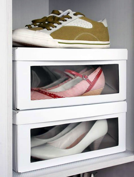 Коробки с прозрачными стенками. | Фото: Pinterest. Чтобы легко находить нужную пару, храните обувь в коробках с прозрачными стенками. Такие коробки можно упаковать в шкаф или поставить на виду, на полки открытого стеллажа.