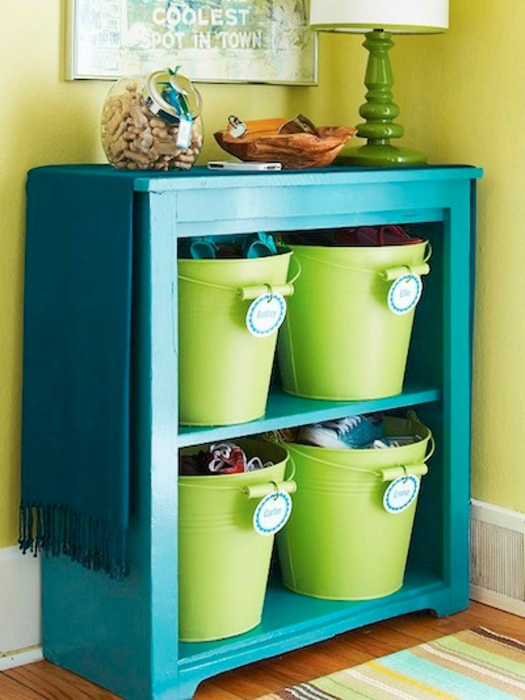 Обувь в ведрах. | Фото: Almanaque SOS. Домашние тапочки, балетки, вьетнамки, кеды и мокасины можно хранить в небольших ярких ведерках. Сами ведра можно поставишь в ячейки невысокого шкафчика.