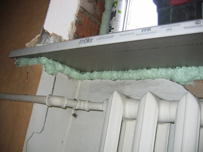 Важно: при монтаже подоконника с использованием пены необходимо учитывать, из какого материала он сделан. В некоторые случаях нужно дополнительно применять теплоизоляцию, в противном случае конденсат разрушит конструкцию.