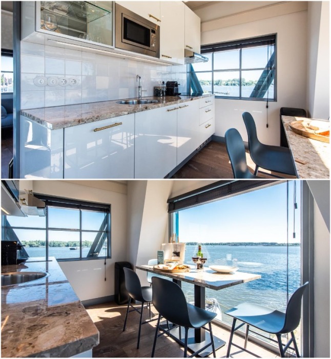 В апартаментах есть благоустроенная кухня и столовая с великолепным видом из окна (Yays Crane Apartment, Амстердам). | Фото: smartertravel.com.
