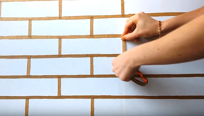Затем можно приступать к разметке стен. Используя лазерный уровень, наклейте сначала горизонтальные полосы малярной лентой шириной не более 1,8 см., а потом короткие вертикальные в шахматном порядке (как идет настоящая кладка). Стандартный размер для обычного кирпича 25х7 см., но с этим можно импровизировать. Если нет лазерного уровня, можно использовать обычный, но это займет намного больше времени, ведь именно процесс разметки у большинства людей вызывает самое большое неприятие. Для упрощения самого нудного и скрупулезного процесса можно наклеить поперечные полосы только на двух-трех нижних рядах по уровню, а дальше это можно делать на глаз.