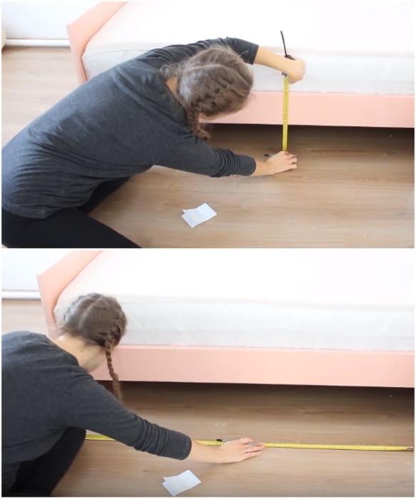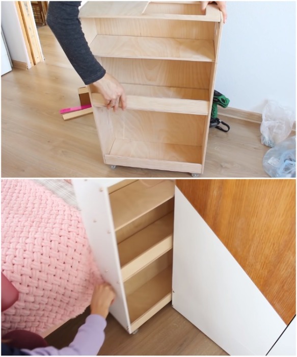 Даже 16 см. свободной площади можно заполнить прикроватной тумбой сделанной собственными руками. | Фото: youtube.com/ Bubenitta.
