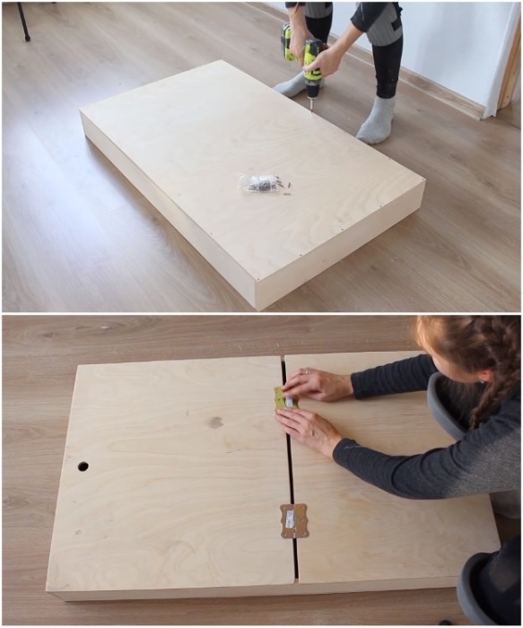 На готовый каркас нужно закрепить дно и крышку с петлями. | Фото: youtube.com/ Bubenitta.
