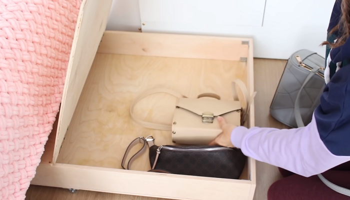 Благодаря сделанным ящикам удалось пристроить разросшуюся коллекцию сумочек. | Фото: youtube.com/ Bubenitta.