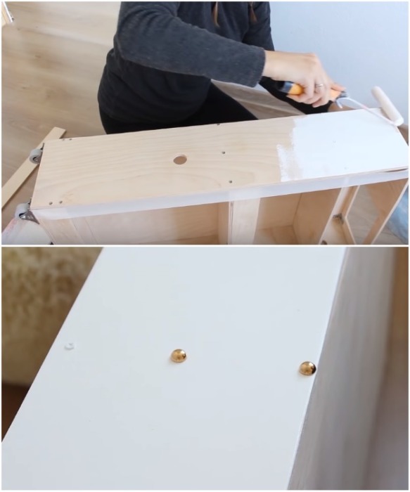 Торцевую сторону прикроватной тумбы Надежда покрасила в белый цвет, а шляпки от саморезов замаскировала золотистыми полубусинами. | Фото: youtube.com/ Bubenitta.