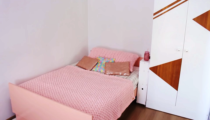 С помощью оригинального текстиля и нескольких очаровательных подушек был сделан последний штрих в преображении спальной зоны. | Фото: youtube.com/ Bubenitta. На этом переделки спальной зоны закончились, следующим этапом Надежда пообещала показать, как она обустроила рабочий уголок в этой комнате. Некоторые девушки, несмотря на внешнюю хрупкость настолько креативны и изобретательны, что диву даешься, на что они способны. Причем далекие от строительных профессий мастерицы умудряются самостоятельно изменить интерьер комнаты до неузнаваемости всего лишь за 5 дней.