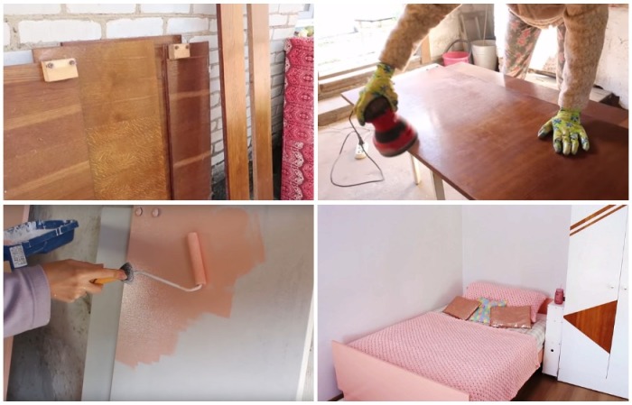 Для того чтобы придать старой мебели современный и более гламурный вид, девушке понадобились грунтовка под акриловую краску, непосредственно сама акриловая краска нужного цвета, бесцветный лак для мебели, кисточки и велюровые валики для покраски, интересные украшения для маскировки шляпок саморезов, колесики для выдвижных систем хранения, металлические уголки для скрепления деталей, ткань и поролон для наматрасника. Поскольку у нее осталось много фанеры после предыдущих переделок, то на создание выдвижных ящиков и узкой прикроватной тумбочки дополнительных материалов покупать не пришлось. К своему новому эксперименту девушка подготовилась основательно и все-таки решилась на приобретение электролобзика и небольшой шлифовальной машинки.