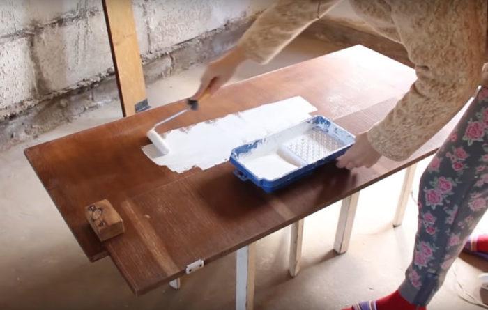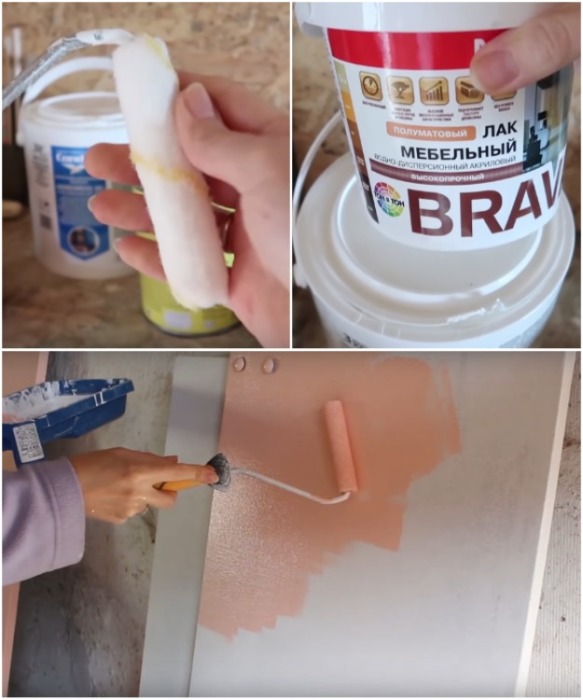 Чтобы обновить старую мебель понадобится краска нужного оттенка, мебельный лак и велюровый валик. | Фото: youtube.com/ Bubenitta.