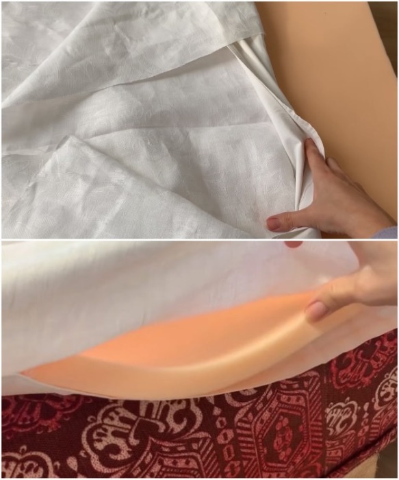Для начала она по внутренней стороне будущего наматрасника пришила простынь, оставив небольшой кармашек, в который без особых проблем поместила поролон, разровняла и зафиксировала его в углах, чтобы он не двигался сам по себе. По нижней части полотна сделала подворот ткани, прострочила и продела обычную резинку. После этого осталось только его надеть, и можно было устанавливать преображенную кровать на свое место.