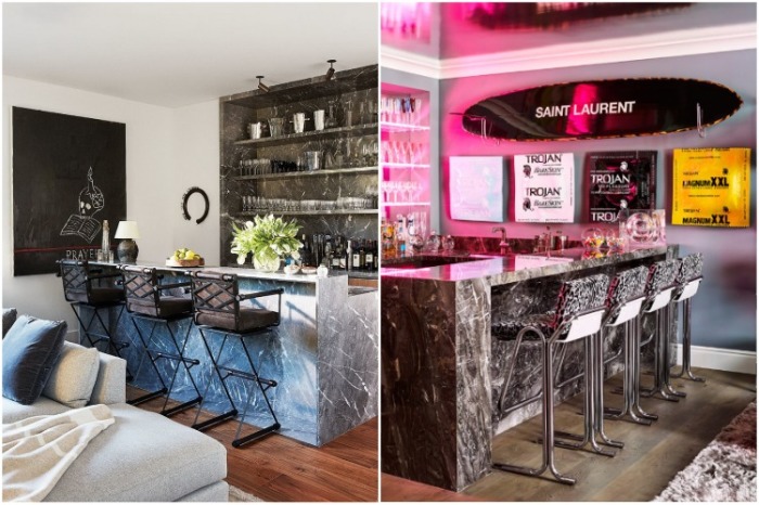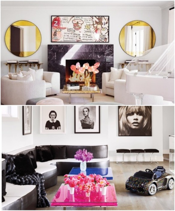 Роскошь и гламур явно просматривается в гостиной с ее монохромным голливудским убранством и белым глянцевым роялем со стеклянной крышкой, покрытые золотой фольгой потолки в столовой и винтажная мебель от Karl Springer и Tom Dixon, обилие неоновых вывесок и куче всевозможных деталей. Чего только стоят коллекции фотографий, картин и инсталляций, от которых просто разбегаются глаза. В интерьер «взрослого» дома удивляет и восхищает все, начиная с полотен с изображением знаменитых на весь мир див – Мэрилин Монро, Брижит Бардо, Одри Хепберн, Твигги, работ художников Бью Данна и Энди Уорхола и заканчивая инсталляциями с доской для серфинга и арт-объектом, созданным из ... огромных упаковок презервативов с говорящим названием «Размер имеет значение» (работа художницы Бо Данн).