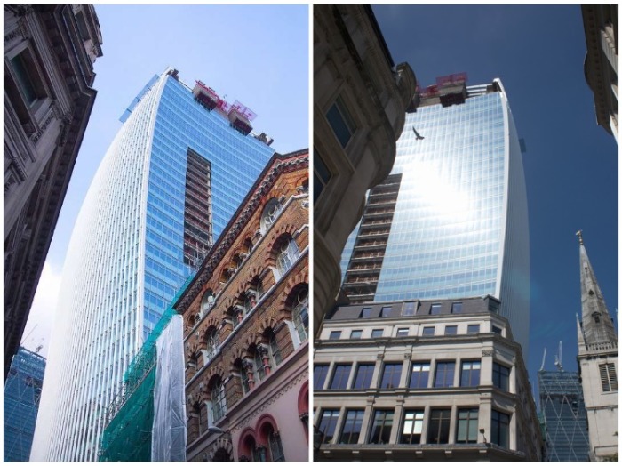 Недостроенный бизнес-центр Walkie Talkie стал главной знаменитостью Лондона из-за неправильно спроектированных окон. (Великобритания). | Фото: divo-ra.blogspot.com.
