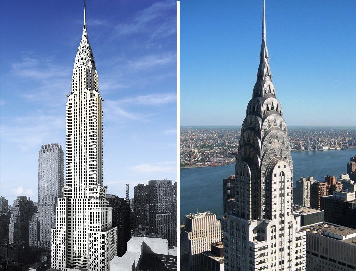 На заре прошлого века архитекторы и заказчики в стремлении создать самое высокое здание в мире шли на самые невероятные ухищрения. Так, например, во время строительства офиса для известной на весь мир компании Chrysler, чтобы перещеголять соперника, который строил высотку на Уолл-стрит № 40, архитектор втайне спроектировал шпиль, позволивший вырваться вперед настолько, что Chrysler Building был признан самым высоким зданием мира. Причем ему удалось все-таки перещеголять Эйфелеву башню. И самое интересное, чтобы застать соперника врасплох и тот ничего не смог уже предпринять, внутри сооружения создавали 38 метровый шпиль, который установили всего лишь за 1,5 часа. В итоге конкурирующая фирма осталась с носом, ведь Chrysler Building достиг высоты 319 м., что позволило получить статус «самое высокое здание мира», хотя пальму первенства он держал всего лишь 11 месяцев.