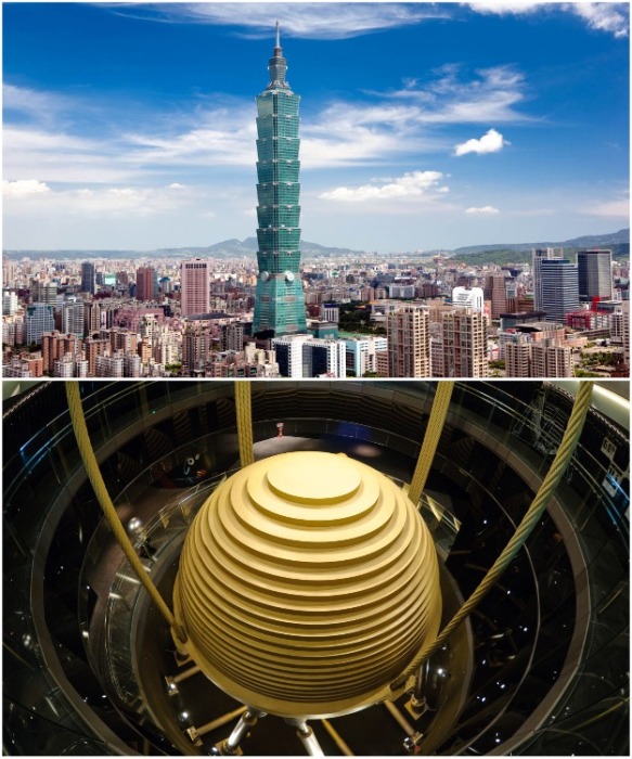 Странную на первый взгляд конструкцию небоскреба Тайбэй 101 придумали архитекторы Тайваня. Они установили 660-тонный стальной шар, подвешенный между 87 и 91 этажами 500 метрового здания. Как оказалось, он служит в качестве многочастотного успокоителя колебаний во время землетрясения или мощного урагана. Учитывая инновационные методы строительства и некоторые хитрости, способствующие безопасности нахождения в высоченном здании после сдачи его в эксплуатацию он был признан одним из семи технических чудес света.