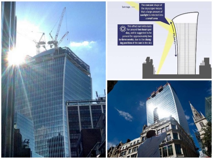 Именно этот эффект и вызывает все вышеперечисленные неприятности. Точно известно о случае, произошедшем в 2013 г., когда в Лондоне возле строящего 37-этажного бизнес-центра Walkie Talkie расплавились боковые панели автомобиля Jaguar, припаркованного неподалеку, а также возгорания коврика у порога магазина и расплавление пластиковых бутылок из-под шампуней и бальзамов в парикмахерской напротив стройки. Эти случаи настолько впечатлили местных жителей, что они наперебой жарили яичницу, гамбургеры и овощи прямо на тротуарах. Впоследствии такие экстремальные развлечения запретили, а наиболее пострадавшим владельцам выплатили компенсацию.